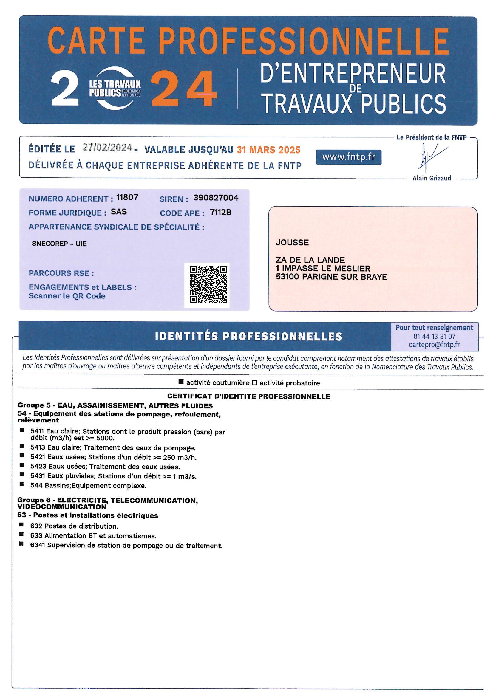Carte professionnelle d'entrepreneur de travaux publics FNTP
